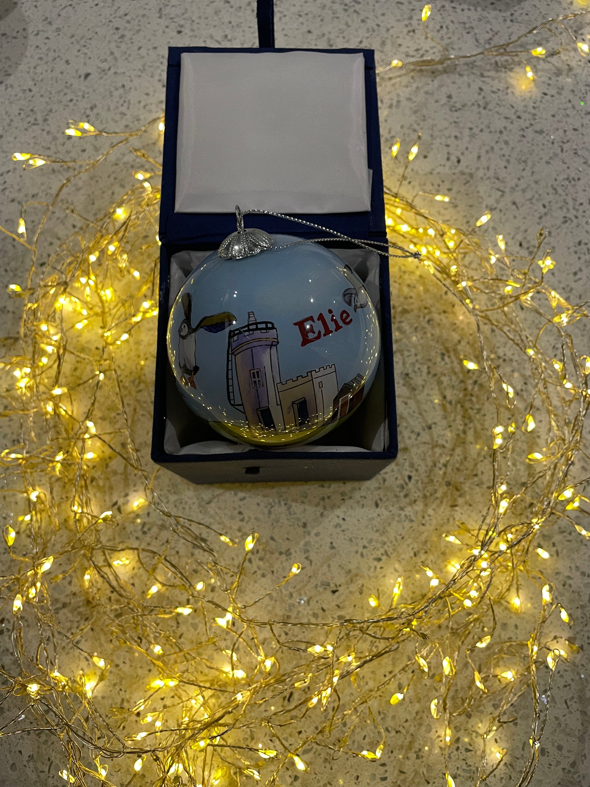 Measuring 8cm x 8cm x 8cm, this bauble is hand painted and made from glass.